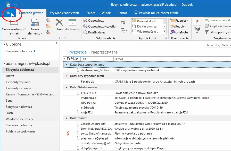 W otwartym programie Outlook klikamy zakładkę „Plik”.