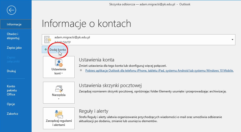 W kolejnym oknie klikamy „Dodaj konto”.