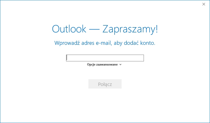 W czasie pierwszego po instalacji uruchomienia programu pocztowego, Outlook automatycznie proponuje skonfigurowanie konta pocztowego, wyświetlając poniższy formularz.