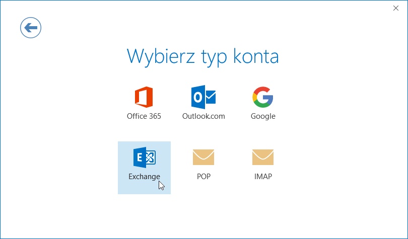 W kolejnym okienku wybieramy typ konta klikając ikonę „Exchange”.