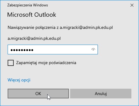 Adres email w polu „Nazwa użytkownika” zastępujemy nazwą (loginem) do konta (bez @pk.edu.pl – jak na poniższym obrazku).
