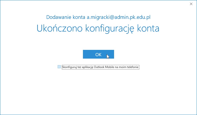 Komunikat w wyświetlonym okienku informuje nas, że konfiguracja konta została zakończona.