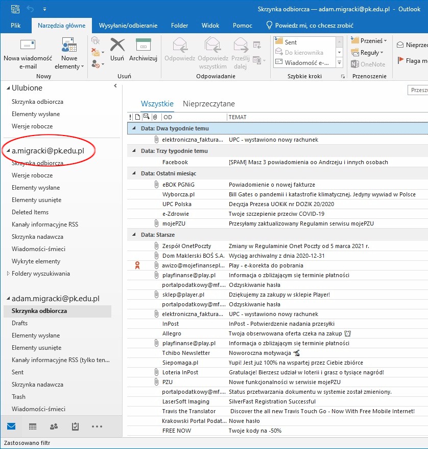 W okienku folderów (lewa część okna Outlook) widoczne są skonfigurowane w programie konta wraz z całą strukturą folderów. Klikamy folder, z którego chcemy przenieść wiadomości do nowej lokalizacji. W głównym oknie programu wyświetlona zostanie zawartość wybranego folderu.