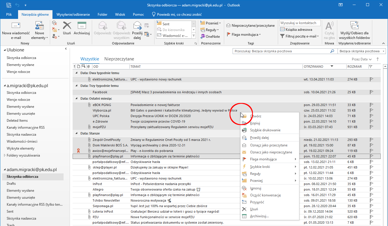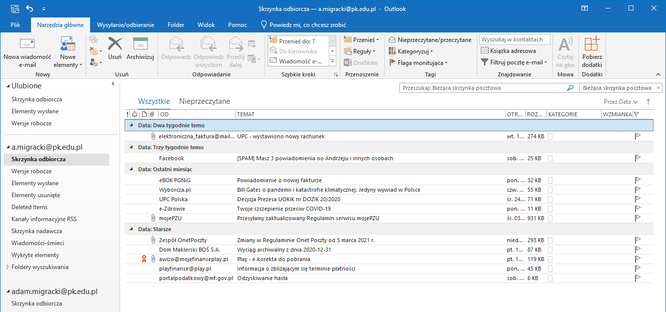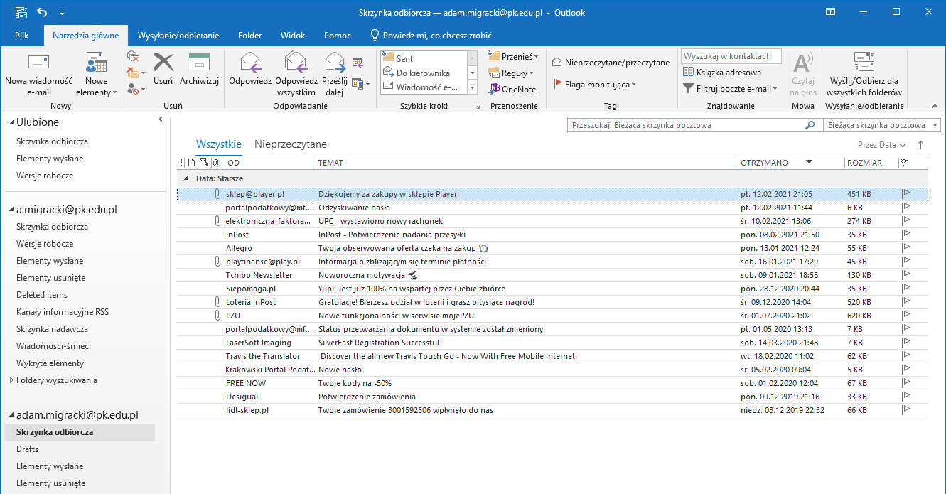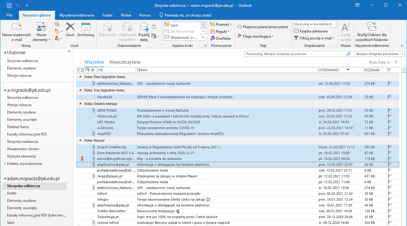 W okienku folderów (lewa część okna Outlook) widoczne są skonfigurowane w programie konta wraz z całą strukturą folderów. Klikamy folder, z którego chcemy przenieść wiadomości do nowej lokalizacji. W głównym oknie programu wyświetlona zostanie zawartość wybranego folderu.
