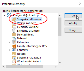 W wyświetlonym okienku odnajdujemy folder, do którego chcemy przenieść wybrane wiadomości. Zaznaczamy go, a następnie klikamy przycisk „OK”.